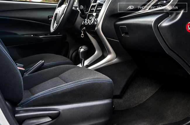 While there are several things to sacrifice on the exterior if you’ll opt for the Yaris E, the interior is a different story. You’ll essentially get the same look inside the E compared to the G, sans the red accents and some functionalities. This includes the open, spacious feeling inside the cabin, along with well-placed buttons, padded armrest by the doors, and the well-bolstered seats clad with suede-like fabric. The contrasting red stitches have been replaced with blue, which is fine in our books.