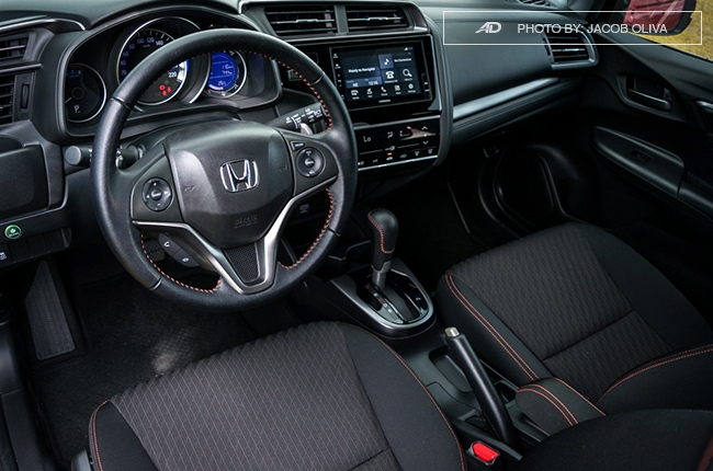 The RS treatment is somehow limited to the Jazz’s exterior — with the exception of extra grab rail, dark silver door handle, and orange stitches on the steering wheel and fabric seats found inside the dark-themed cabin. Although there are some hard plastics, it’s generally made of high-quality materials, while the panels are intact and seamless.